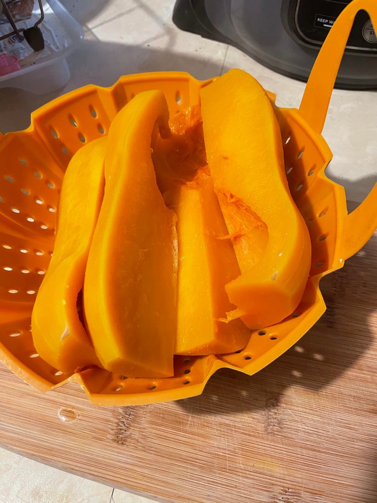 This recipe requires an Insta pot and an air fryer. This is one of my favorite things to make and sometimes I’ll just eat half a butternut squash for lunch because I can’t stop eating them when I make them for meal prep! Normally I can get two meals for two people plus I have created another recipe using the bottom half of the butternut from this recipe in a butternut hummus that is out of this world! That recipe will be posted shortly 😉 so one butternut squash goes a long way!