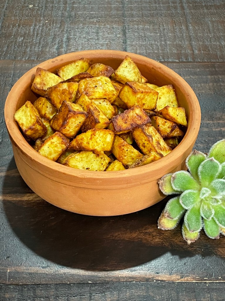 Directions: peel and chop potatoes into small 1/2 inch cubes. In mixing bowl evenly coat or spray with olive oil. Then stir in spices salt and pepper. Cook in air fryer at 390 degrees for 20 minutes. Stir halfway thru spray with more olive oil and adjust salt if necessary.
