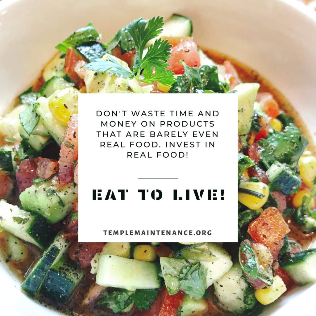 Eating to live is very simple. Eat real food. Real food is straight from the earth or very minimally processed. People today spend a lot of time and money ingesting food products that serve close to zero benefit. Most food products do the opposite of what we are hoping, we are hoping for health and an energy boost but instead get disease.